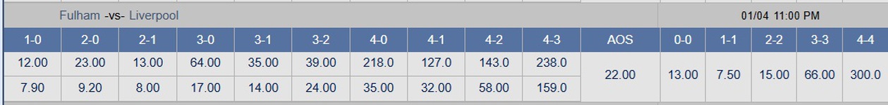 Tỉ lệ trận đấu ngay từ đầu đã xác định Liverpool chấp chủ nhà Fulham đến nửa trái, ăn 97, thua 90. Đến tối qua, thị trường vẫn nghiêng về đội khách nên Liverpool chấp nửa trái, ăn 95, thua 92. Xu thế đổ cửa trên vẫn tiếp tục khi đến trưa nay Liverpool ăn 9 và thua đủ. Dù sao, chọn cửa trên vẫn vui hơn trong trận đấu có nhiều bàn thắng.