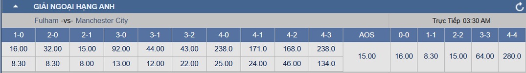 Tỉ lệ ban đầu của trận đấu là Manchester City chấp nửa một, lún tiền, ăn 82 thua đủ. Đến sáng nay, giá có nhích đôi chút thành ăn 8, thua đủ. Dù sao thì chọn Manchester City vẫn an toàn hơn, bởi họ biết cách và cũng có thói quen thắng Fulham.