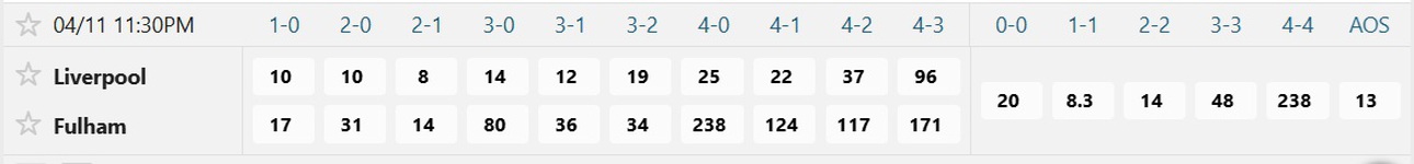 Tỉ số được ưa chuộng nhất là Liverpool thắng 2-1 với mệnh giá đặt 1 ăn 8, nhưng sát cạnh bên là kết quả hòa 1-1 với mệnh giá đặt 1 ăn 8.3. Niềm tin vào chiến thắng của Liverpool khôn g lớn nên các tỉ số 1-0 và 2-0 chỉ ăn 10, 3-1 ăn 12, còn 3-0 ăn 14. Cơ hội của Fulham không thể xem thường khi cửa thắng 1-2 của đội khách có giá đặt 1 ăn 14, cỏn 0-1 ăn 17.