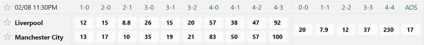 Tỉ số phổ biến nhất vẫn là kết quả hòa 1-1 với mệnh giá đặt 1 ăn 7.9, trong lúc hòa 2-2 ăn 12, còn 0-0 ăn đến 20. Đa số người chơi chọn chiến thắng sít sao 2-1 của Liverpool với giá đặt 1 ăn 8.8, còn 1-0 ăn 12, 2-0 và 3-1 ăn đến 15. Cửa thắng của Manchester City cũng thu hút nhiều người khi 1-2 có giá đặt 1 ăn 10, 0-1 ăn 13, 0-2 ăn đến 17 và 1-3 ăn 19.