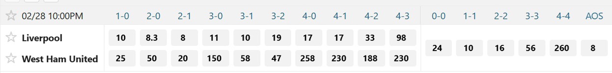 Tỉ số được ưa chuộng nhất là 2-1 với mệnh giá đặt 1 ăn 8, trong lúc 2-0 ăn 8.3, còn 1-0 và 3-1 ăn 10, 3-0 ăn chỉ 11. Tỉ số hòa 1-1 cũng gây nhiều chú ý với giá đặt 1 ăn 10, còn 2-2 ăn đến 16. Cửa thắng của West ham là không thực tế khi 1-2 ăn đến 20, còn 0-1 ăn 25.