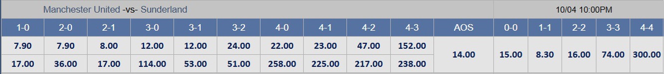 Tỉ số phổ biến nhất là 1-0 và 2-0 với mệnh giá đặt 1 ăn 7.9, trong lúc 2-1 có mệnh giá đặt 1 ăn 8, còn 1-1 có giá 8.3.Cửa thắng của Sunderland không được đánh giá cao khi 0-1 và 1-2 ăn đến 17, còn 0-2 ăn đến 36