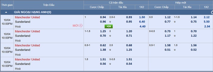 Tỉ lệ trận đấu rất cách biệt khi ra giá Man United chấp đến 1 trái, ăn 9, thua đủ. Một tỉ lệ có vẻ không thực tế với phong độ hiện thời. Bởi không thể nào chủ nhà có thể chấp đến 1 trái trước đối thủ đứng trên mình 8 bậc ở Premier League.