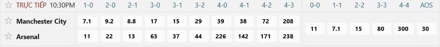 Tỉ số được ưa chuộng nhất là kết quả hòa 1-1 và chiến thắng 1-0 của Manchester City khi có cùng mệnh giá đặt 1 ăn 7.1. Các kết quả hòa khác đều khá mạo hiểm khi 0-0 có giá đặt 1 ăn 11, còn 2-2 ăn 15.Cửa thắng của Manchester City vẫn thu hút nhiều sự quan tâm khi 2-1 có mệnh giá đặt 1 ăn 8.8, còn 2-0 ăn 9.2. Arsenal sẽ hài lòng với kết quả hòa nhưng khả năng thắng của họ cũng không nhỏ khi 0-1 có mệnh giá đặt 1 ăn 11, 1-2 ăn 13, còn 0-2 ăn đến 22.