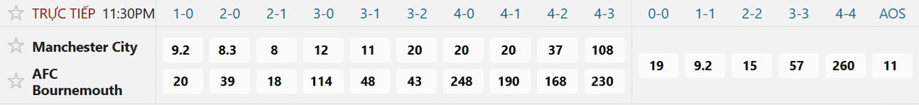 Tỉ số được ưa chuộng nhất là Manchester City thắng 2-1 mang mệnh giá đặt 1 ăn 8, trong lúc 2-0 có giá 8.3 còn 1-0 ăn đến 9.2. Khả năng ghi bàn của Bournemouth được ghi nhận khi tỉ số 3-1 có mệnh giá đặt 1 ăn chỉ 11. Hòa cũng là một đáp án được nhiều người chọn khi tỉ số 1-1 có giá đặt 1 ăn chỉ 9.2.