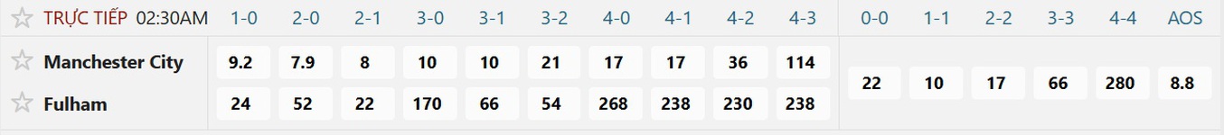 Tỉ số được ưa chuộng nhất là 2-0 với mệnh giá đặt 1 ăn chỉ 7.9, trong lúc 2-1 ăn 8, còn 1-0 ăn 9.2, và 3-0, 3-1 ăn đến 10. Tỉ số hòa 1-1 cũng là đáp án của nhiều người khi có giá đặt 1 ăn 10, còn 2-2 ăn đến 17. Khả năng thắng của Fulham là thiếu thực tế khi 2-1 có giá đặt 1 ăn đến 22, còn 1-0 ăn 24.