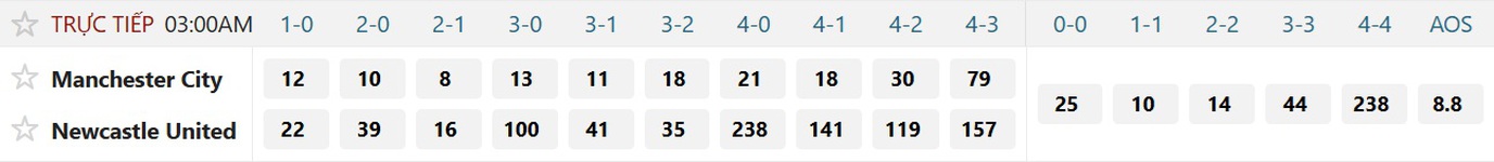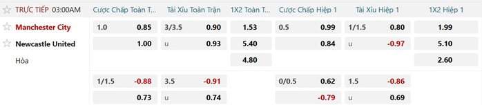 Ti lệ trận đấu giống hệt mùa trước khi Manchester City chấp Newcastle đến 1 trái 1 trái rưỡi, cho lựa. Đến hôm qua, giá đã chuyển dần thành Newcastle ăn chỉ 87, thua đủ, cho thấy thị trường đang đổ mạnh vào cửa dưới. Xu thế này vẫn không thay đổi vào trưa nay khi tỉ lệ đã chuyển xuống thành Manchester City chấp chỉ còn 1 trái, lún tiền (ăn 87, thua đủ).