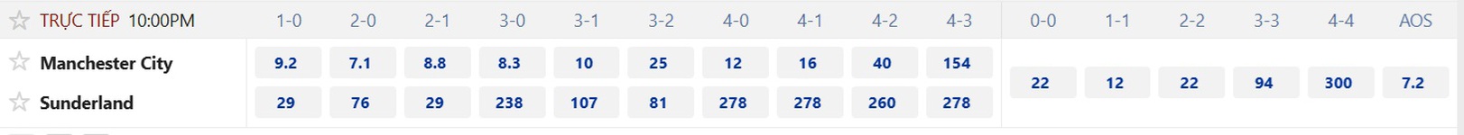Tỉ lệ trận đấu ngay từ đầu đã rất chênh lệch khi Manchester City chấp ngựa ô Sunderland đến 1 trái rưỡi 2 trái, ăn 97 và thua 90. Tỉ lệ này khiến các fan Manchester City cũng chùn tay. Tuy nhiên, phản ứng của thị trường lại không đổ cửa dưới như dự báo. Sáng nay, tỉ lệ vẫn là 1 trái rưỡi 2 tráo và Manchester City ăn đủ, thua 9. Dù sao, chọn cửa dưới vẫn an toàn hơn.