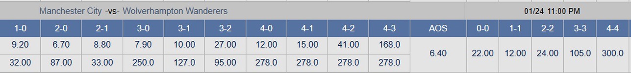 Tỉ số được ưa chuộng nhất là 2-0 với mệnh giá đặt 1 ăn chỉ 6.7, trong lúc 3-0 ăn 7.9, tỉ số 2-1 ăn 8.8, còn 1-0 ăn 9.2. Giới quan sát lưu ý rằng tỉ số 3-1 có giá ăn đến 10, cho thấy người ta không mấy tin Wolves sẽ tung lưới Manchester City – điều cũng giải thích là phơi 'đôi bền cùng ghi bàn' không được ưa chuộng. Hòa không phải là đáp án đúng của trận này khi 1-1 ăn đến 12, còn 0-0 ăn 22. Không ai đặt vào cửa thắng của Wolves dù 0-1 ăn đến 32 và 1-2 ăn 33.