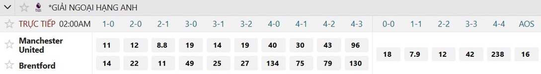 Tỉ số được ưa chuộng nhất là hòa 1-1 với mệnh giá đặt 1 ăn 7.9, trong lúc hòa 2-2 ăn 12, còn 0-0 ăn 18. Cửa thắng của Manchester United rất được chú ý khi 2-1 ăn 8.8, 2-0 ăn 12 còn 1-0 ăn 11, trong lúc 3-1 ăn 14. Điều đáng lưu ý là cửa thắng của Brentford cũng rất được ưa chuộng khi tỉ số 1-2 có mệnh giá đặt 1 ăn 11, trong lúc 0-1 ăn 14, còn 0-2 ăn đến 22.