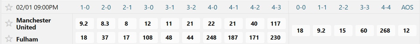 Tỉ số được ưa chuộng nhất là Manchester United thắng 2-1 với mệnh giá đặt 1 ăn chỉ 8, trong lúc 2-0 ăn 8.3, 1-0 ăn 9.2, còn 3-1 ăn 11 và 3-0 ăn 12. Kết quả hòa cũng gây không ít chú ý khi 1-1 có giá đặt 1 ăn 9.2, trong lúc 2-2 ăn đến 15, còn 0-0 ăn 18. Khả năng Fulham giành chiến thắng không được đánh giá cao nhưng 1-0 ăn 18, còn 2-1 ăn 17.