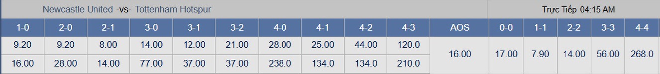 Tỉ lệ ban đầu của trận đấu là Newcastle chấp nửa một, ăn 95, thua 92. Đến sáng nay chủ nhà chỉ còn ăn 90 nhưng thua đến 97, cho thấy thị trường đang độ cửa trên. Chọn chủ nhà yên tâm hơn.