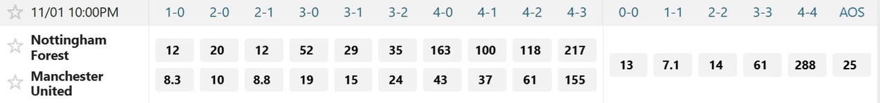 Thật bất ngờ khi tỉ số được ưa chuộng nhất là kết quả hòa 1-1 với mệnh giá đặt 1 ăn chỉ 7.1. Nhưng cũng có nhiều người chọn Manchester United thắng với tỉ số 0-1 có giá 8.3, còn 1-2 đặt 1 ăn 8.8, 0-2 ăn chẵn 10. Cách không xa mấy là những dự báo Nottingham gây bất ngờ khi 1-0 và 2-1 có giá đặt 1 ăn 12.