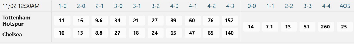 Tỉ số được ưa chuộng nhất là 1-1 với mệnh giá đặt 1 ăn 7.1. Cửa thắng của Chelsea được đánh giá cao hơn một chút khi 1-2 có mệnh giá đặt 1 ăn 8.8, 0-1 ăn 10, còn 0-2 ăn 13. Ngược lại, nhiều người tin Tottenham có thể gây bất ngờ khi tỉ số 2-1 có giá đặt 1 ăn 9.6, còn 1-0 có giá đặt 1 ăn 11 và 2-0 ăn 16.