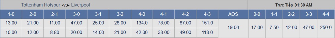Tỉ số phổ biến nhất vẫn là 1-1 với mệnh giá đặt 1 ăn 7.5, trong lúc 2-2 ăn 12, còn 0-0 ăn đến 17. Cừa thắng của Tottenham không được đánh giá cao khi tỉ số 2-1 có mệnh giá đặt 1 ăn 11, còn 1-0 ăn đến 13. Sức hút dồn vào cửa thắng của Liverpool khi 1-2 có mệnh giá đặt 1 ăn 8.8, 0-1 có giá ăn 10, còn 0-2 ăn 12.