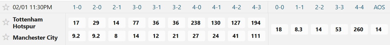 Tỉ số được ưa chuộng nhất là Manchester City thắng 1-2 với mệnh giá 1 ăn chỉ 8, trong lúc 0-1 và 0-2 đều ăn 9.2, còn 1-3 ăn đến 12. Tỉ số hòa được chú ý nhất là 1-1 với mệnh giá 1 ăn 8.3, trong lúc 0-0 ăn 18, còn 2-2 ăn 14. Cửa thắng cho Tottenham khá hẹp khi tỉ số 2-1 ăn 14 còn 1-0 ăn đến 17.