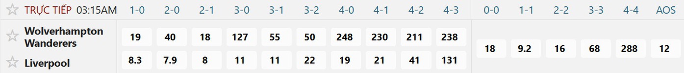 Tỉ số được ưa chuộng nhất là Liverpool thắng 0-2 với mệnh giá đặt 1 ăn 7.9, trong lúc 1-2 ăn 8, còn 0-1 ăn 8.3. Các tỉ số cách biệt như 1-3 và 0-3 đều ăn 11, còn 0-4 ăn 19. Tỉ số hòa 1-1 cũng gây nhiều chú ý với mệnh giá đặt 1 ăn 9.2, còn 2-2 ăn 16. Không mấy ai tin Wolves sẽ thắng nhưng tỉ số 2-1 cũng có giá đặt 1 ăn 18, còn 1-0 ăn 19.