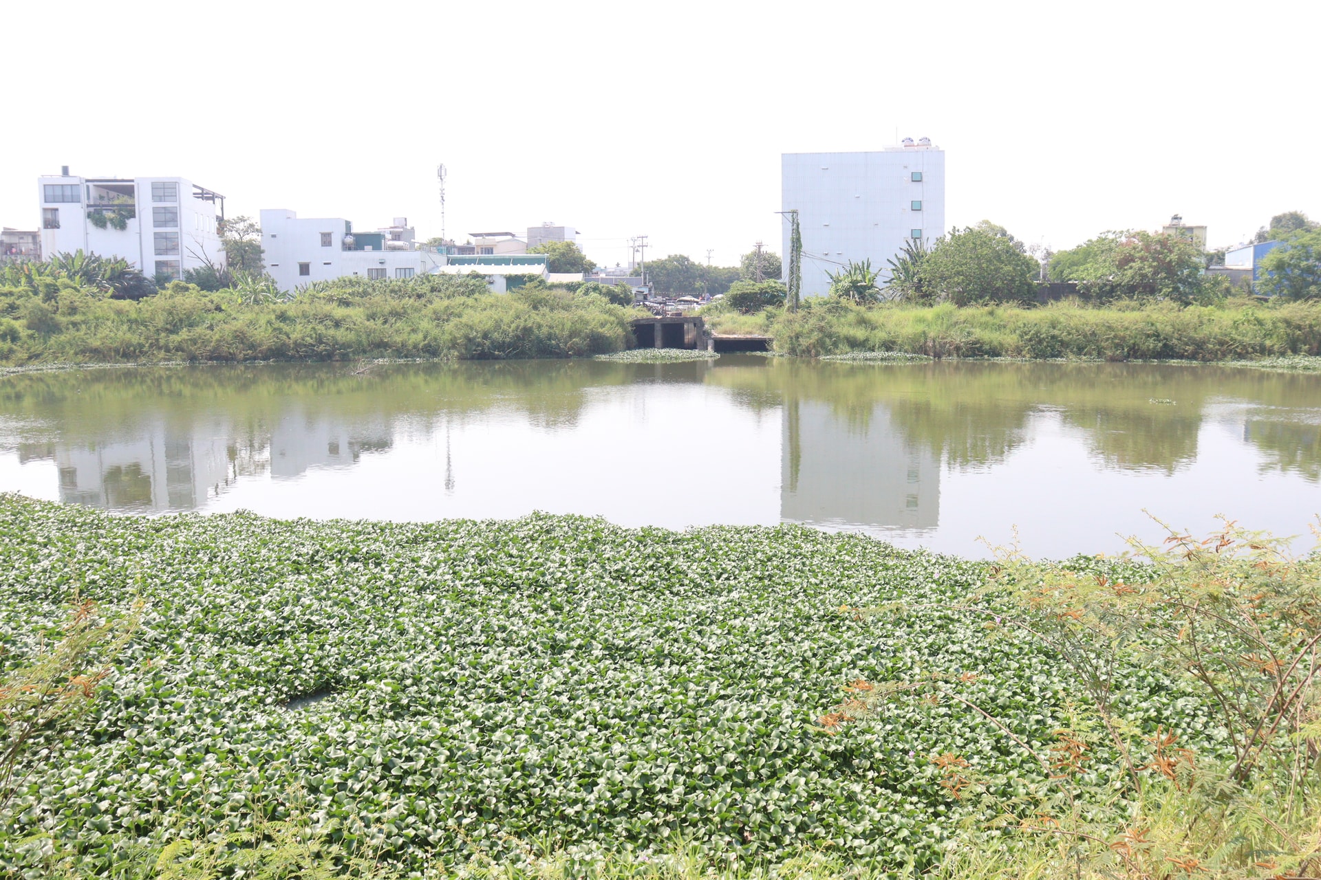Nhiều bèo trên mặt hồ Bàu Gia Thượng (phường Cẩm Lệ) chậm được nạo vét, cải tạo, dễ gây cản trở thoát nước khi mưa lớn. Ảnh: HOÀNG HIỆP
