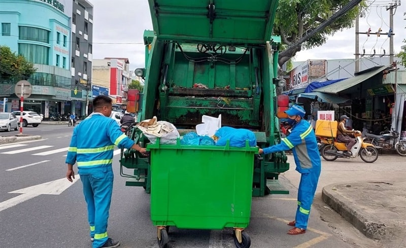 Công nhân Công ty TNHH MTV Môi trường đô thị Hà Nội – Chi nhánh miền Trung thu gom rác trên địa bàn Đà Nẵng. Ảnh: TRỌNG HÙNG