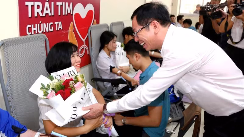 Phó Chủ tịch Ủy ban nhân dân thành phố Hải Phòng Vũ Tiến Phụng động viên người tham gia hiến máu tình nguyện sau lễ phát động. (Ảnh: PV)