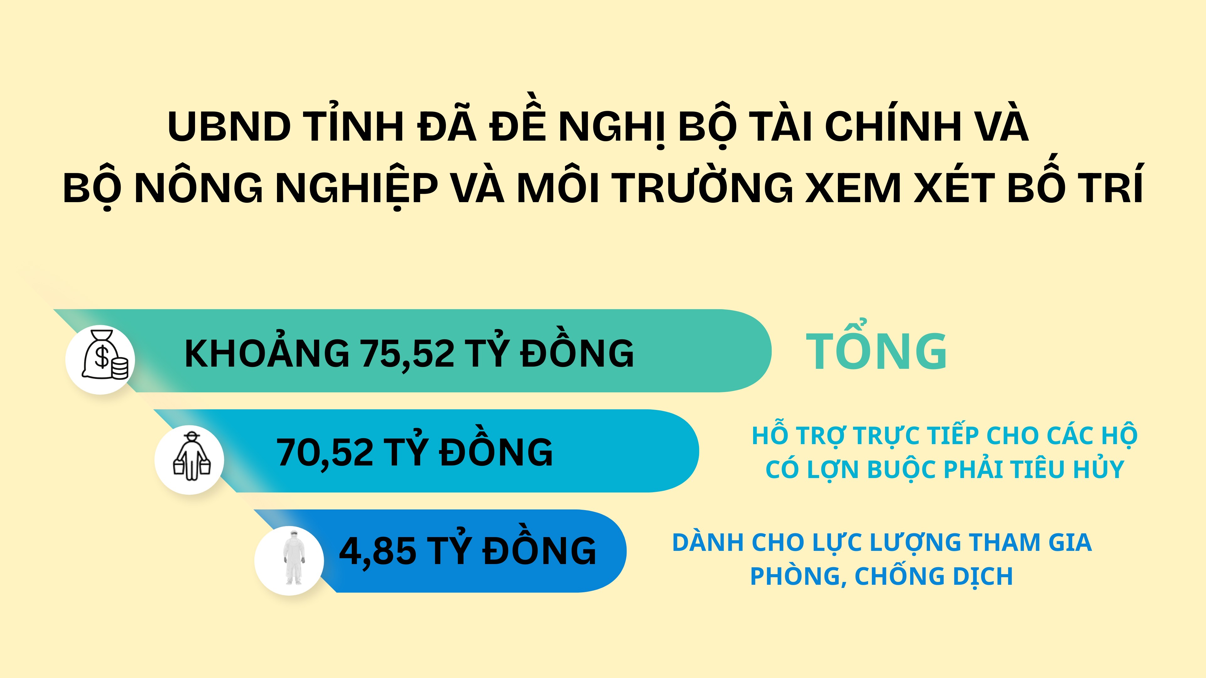 Thiệt hại lớn kéo dài khiến nhiều hộ dân rất khó tái đàn nếu không có nguồn vốn hỗ trợ. UBND tỉnh đã đề nghị Bộ Tài chính và Bộ Nông nghiệp và Môi trường xem xét bố trí khoảng 75,52 tỷ đồng, trong đó 70,52 tỷ đồng hỗ trợ trực tiếp cho các hộ có lợn buộc phải tiêu hủy; 4,85 tỷ đồng dành cho lực lượng tham gia phòng, chống dịch cùng kinh phí mua vật tư bảo hộ và thực hiện xét nghiệm bệnh. Đây là nguồn lực cần thiết để phục hồi chăn nuôi, khi ngân sách địa phương đang gặp nhiều khó khăn do phải tập trung khắc phục hậu quả bão số 10 (Bualoi).
