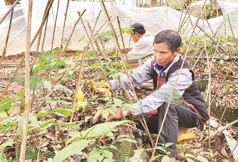 Đồng bào dân tộc thiểu số chăm sóc cây sâm Ngọc Linh. (Ảnh PHÚC THẮNG)
