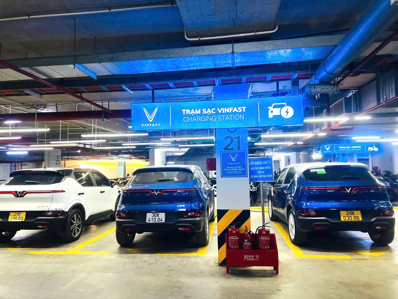 Trạm sạc xe điện dưới tầng hầm một khu chung cư trên địa bàn xã Gia Lâm, TP Hà Nội. Ảnh: Mai Thu.