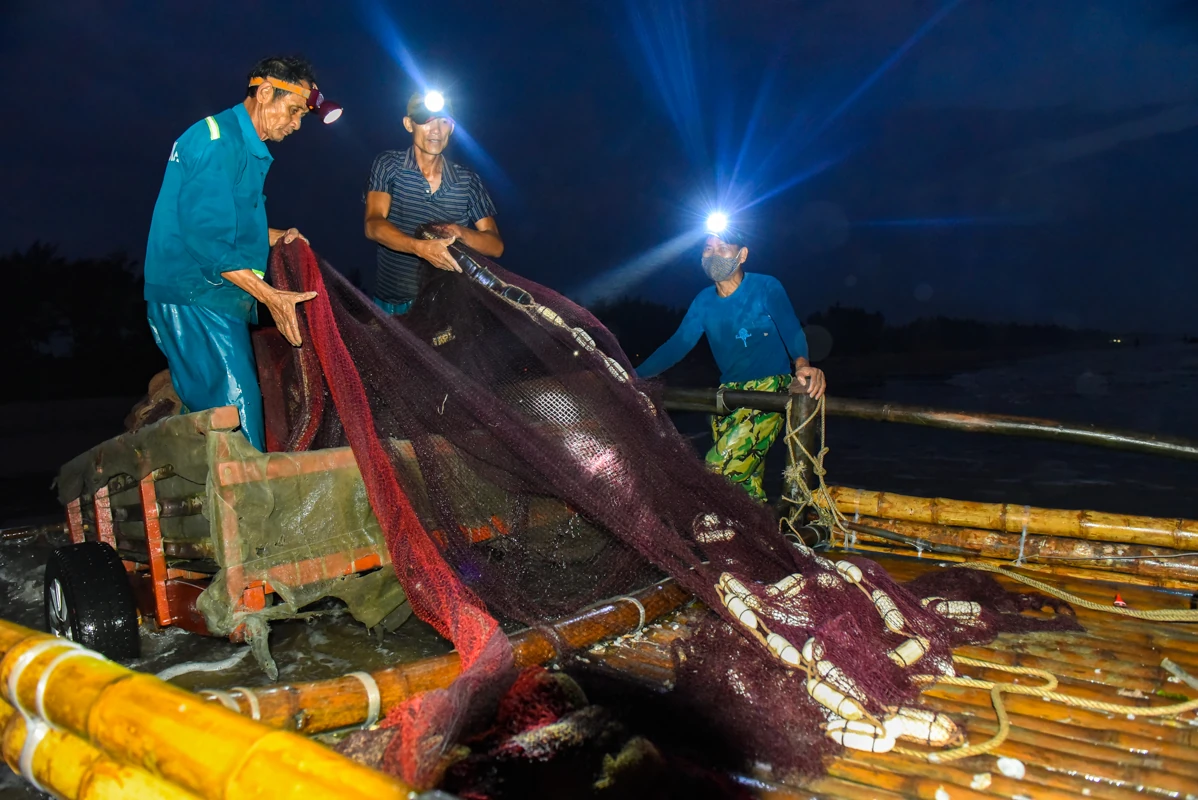 Khi thuyền chạm cát, tiếng máy tắt dần, chỉ còn âm thanh va nhẹ của tiếng sóng lùa qua mạn thuyền. Một vài con thuyền thúng tròn lắc lư, được kéo lên bãi, để lại những vệt tròn in trên cát ẩm. Những ngư dân bước xuống, vai áo sẫm màu nước biển, bàn chân lún sâu trong lớp cát mềm. Họ cúi mình kéo lưới, từng sợi dây căng lên dưới ánh bình minh vừa hé.