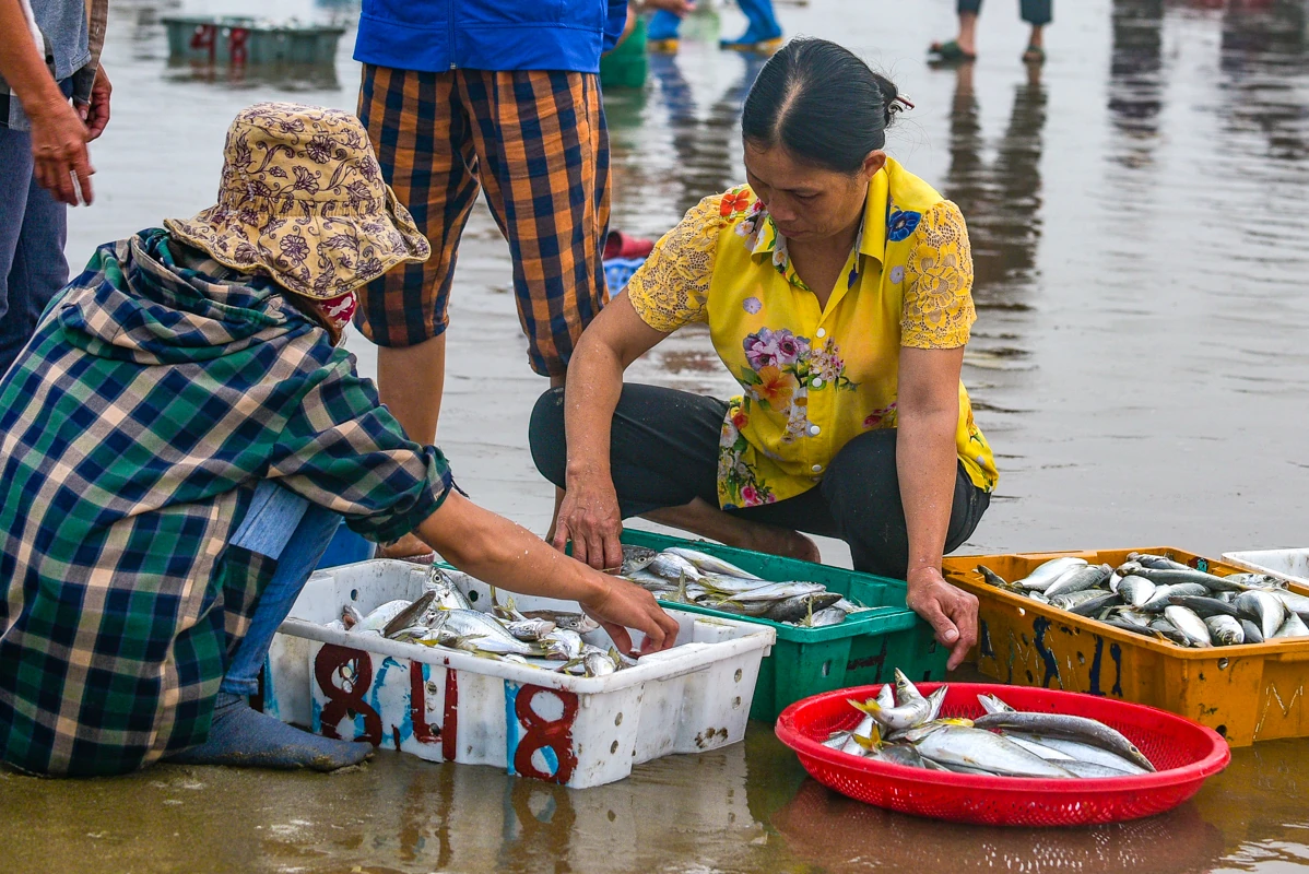 Ngay sát mép nước, “phiên chợ” sớm đã đông dần. Những chiếc quang gánh xếp thành hàng, mẹt tre đặt sát cát, còn vương vài hạt muối trắng li ti. Người mua cúi xuống chọn cá, tay thoăn thoắt lật từng mẻ lưới, mắt ánh lên sự tinh tường của người quen nghề. Có người tranh thủ mặc cả, có người chỉ cần một cái gật đầu là xong cuộc mua bán.