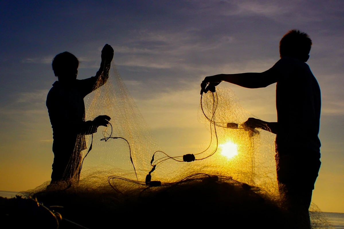 Xa hơn, vài người đàn ông đang soạn lại ngư cụ dưới nắng sáng đầu hôm. Những ngón tay chai sạn đưa kim thoăn thoắt, nối lại từng mắt lưới bị rách sau đêm biển động.