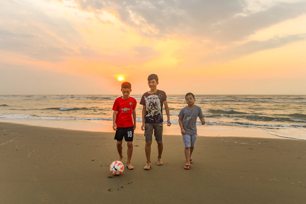 Trẻ con trong làng cũng nhập vào buổi sáng theo cách riêng. Đứa theo mẹ gánh cá về chợ trong, đứa tụm lại trên bãi cát, đá bóng, nhặt vỏ sò, đào những hố nhỏ đón sóng. Có đứa lấy que vẽ những đường nguệch ngoạc trên nền cát ướt, rồi cười vang khi sóng tràn lên xóa đi tất cả. Những âm thanh ấy trong trẻo, nhẹ tênh, như làm dịu đi cái gió mặn và nắng gắt của miền biển.
