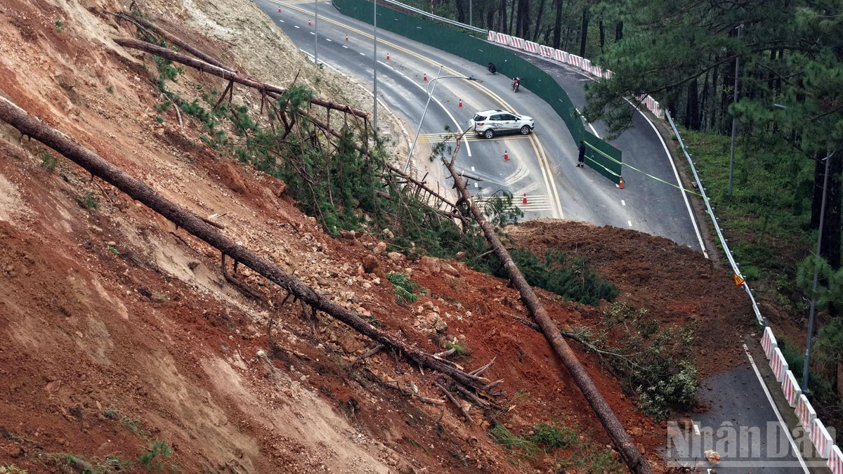 Tại diễn biến khác, tối 3/12, trên tuyến đèo Mimosa, phường Xuân Hương-Đà Lạt, lại xảy ra sự cố sạt lở đất ngay vị trí đường tạm vừa thông tuyến trở lại cách đây vài ngày.