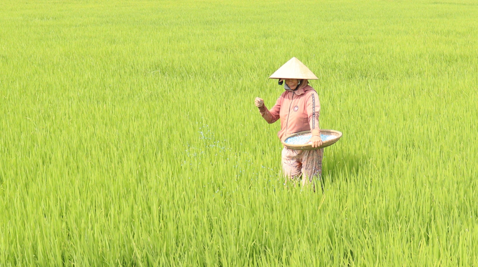 Nông dân vãi phân trên ruộng khô nước. Ảnh: HOÀNG HIỆP