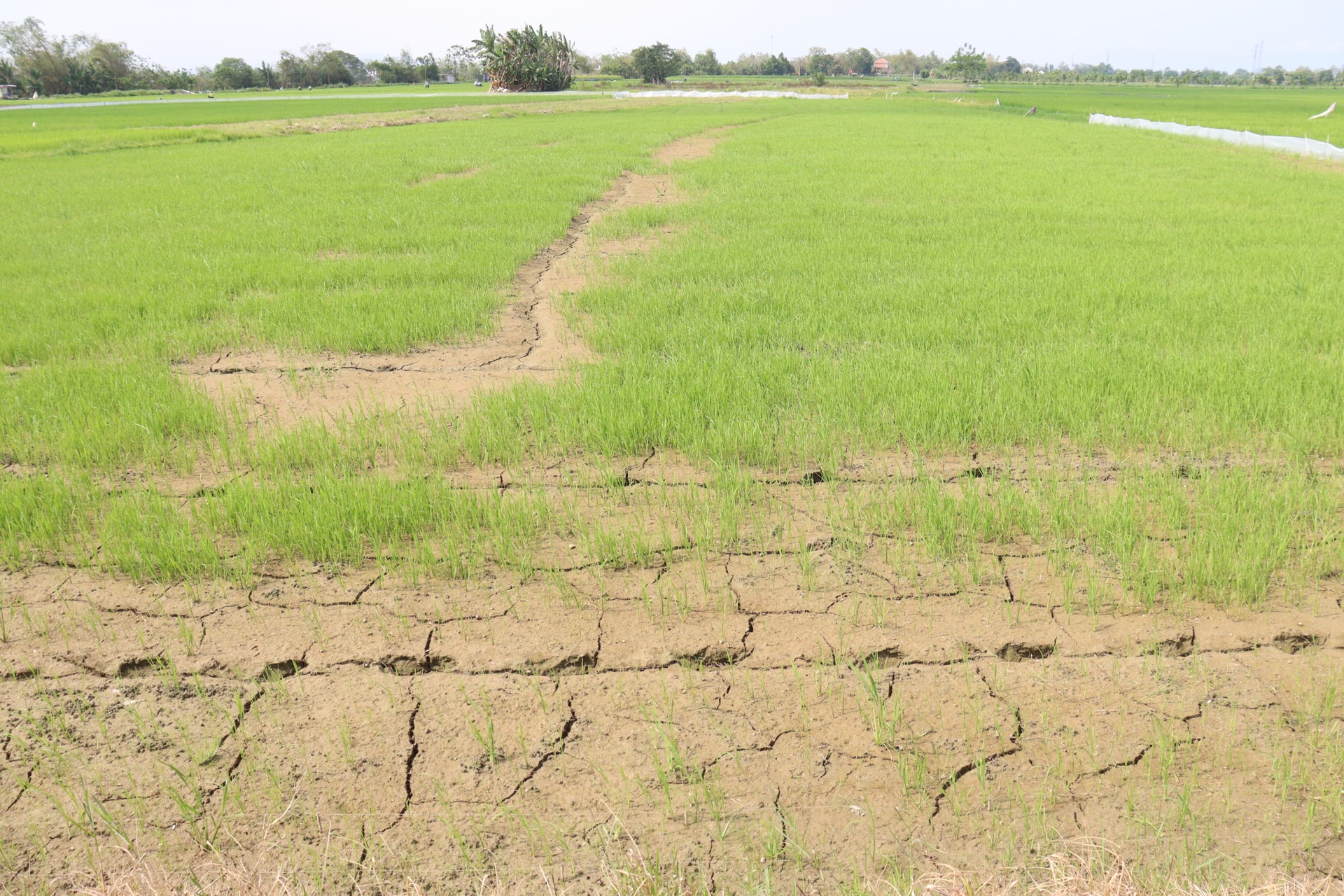 Thửa ruộng thấp ở cánh đồng Phong Hồ, phường Điện Bàn Đông bị thiếu nước tưới nhiều ngày. Ảnh: HOÀNG HIỆP