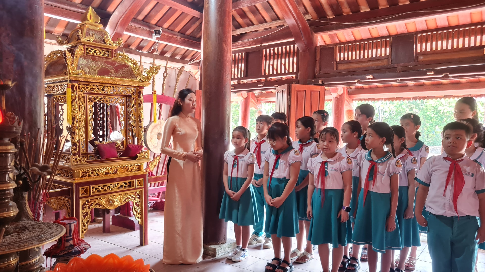 Học sinh xã Sơn Cẩm Hà tìm hiểu về di tích Đình làng Hội An. Ảnh: D.LỆ