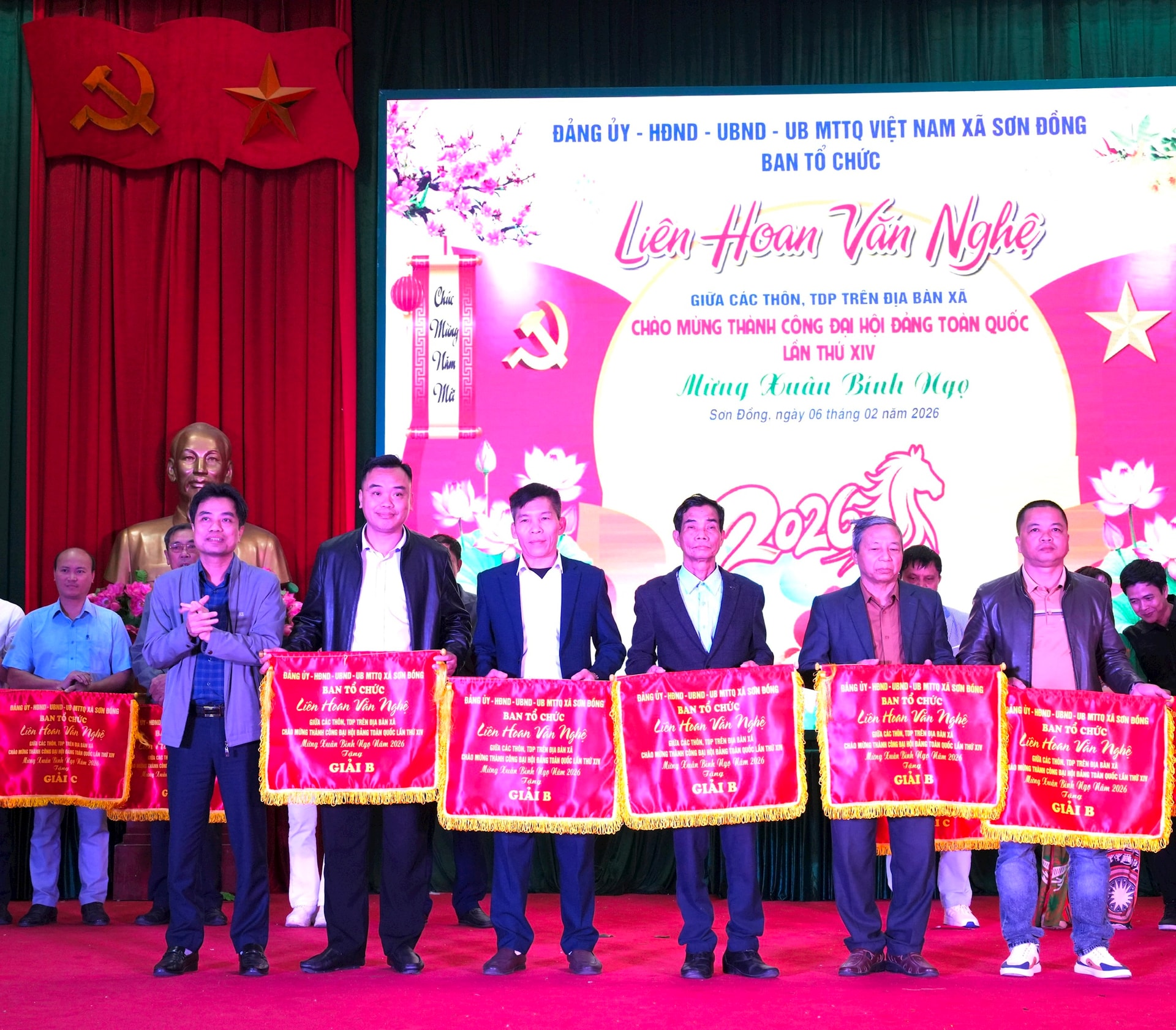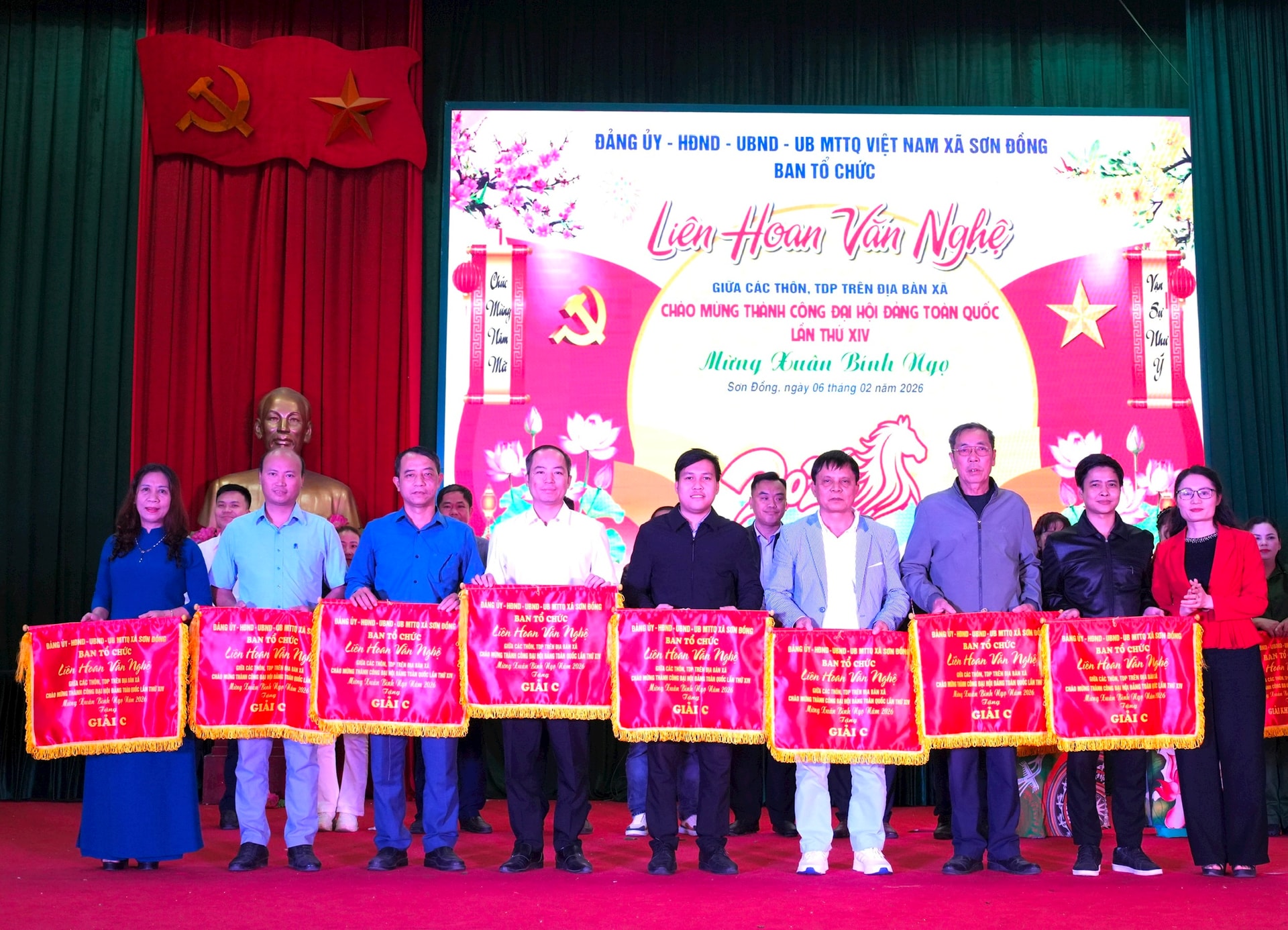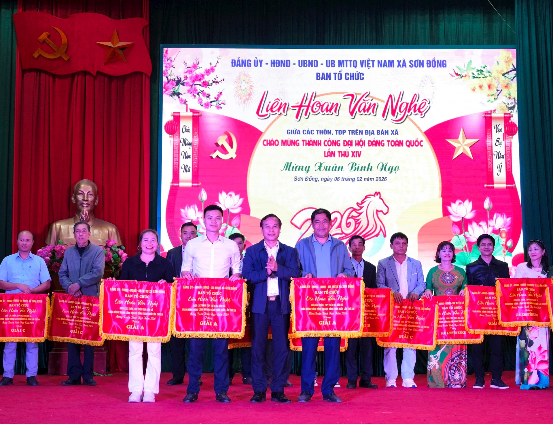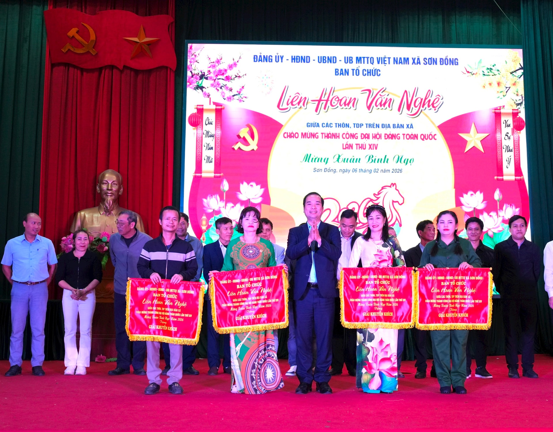 Lãnh đạo xã Sơn Đồng trao cờ cho các đơn vị đạt giải. Ảnh: Thùy Duyên