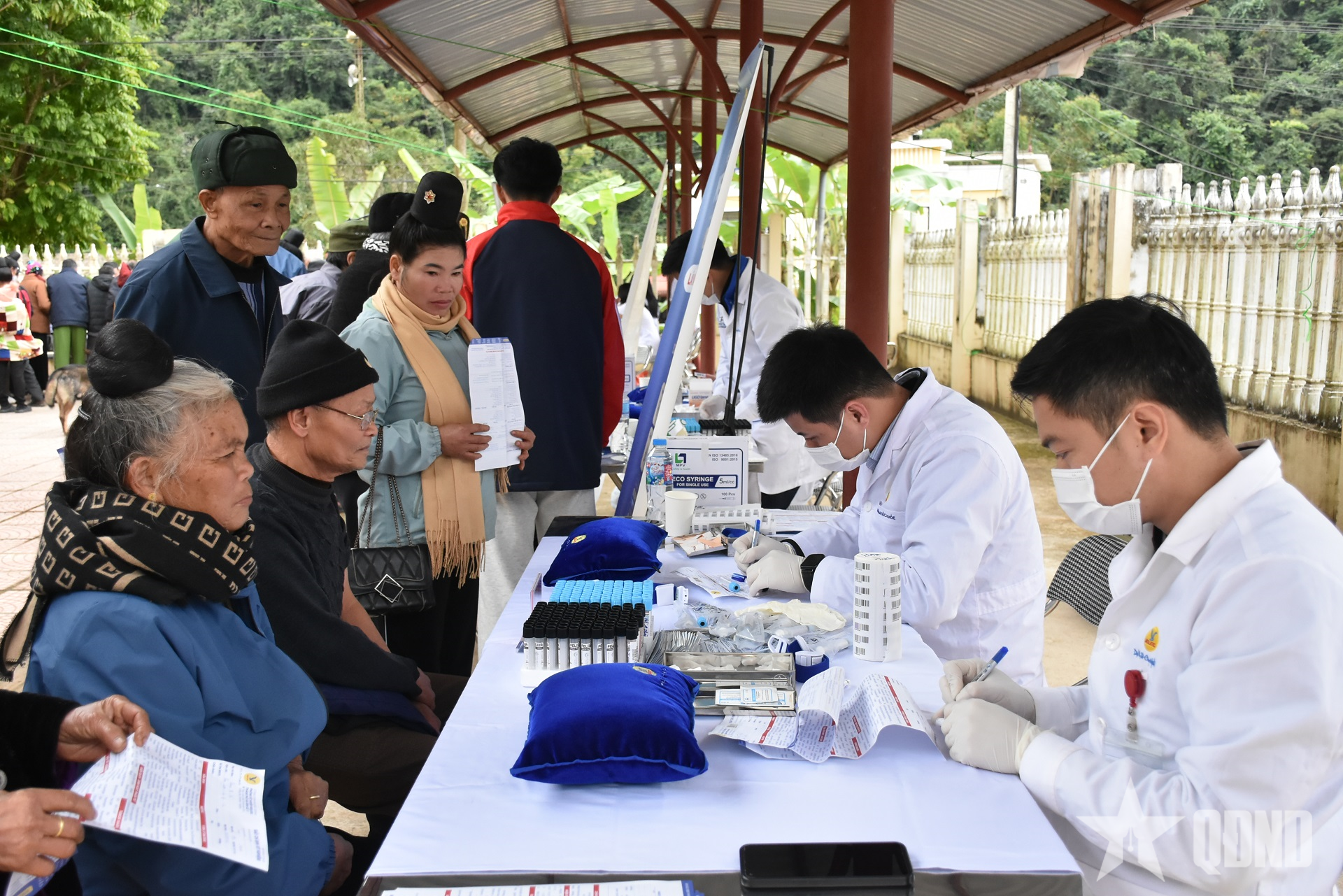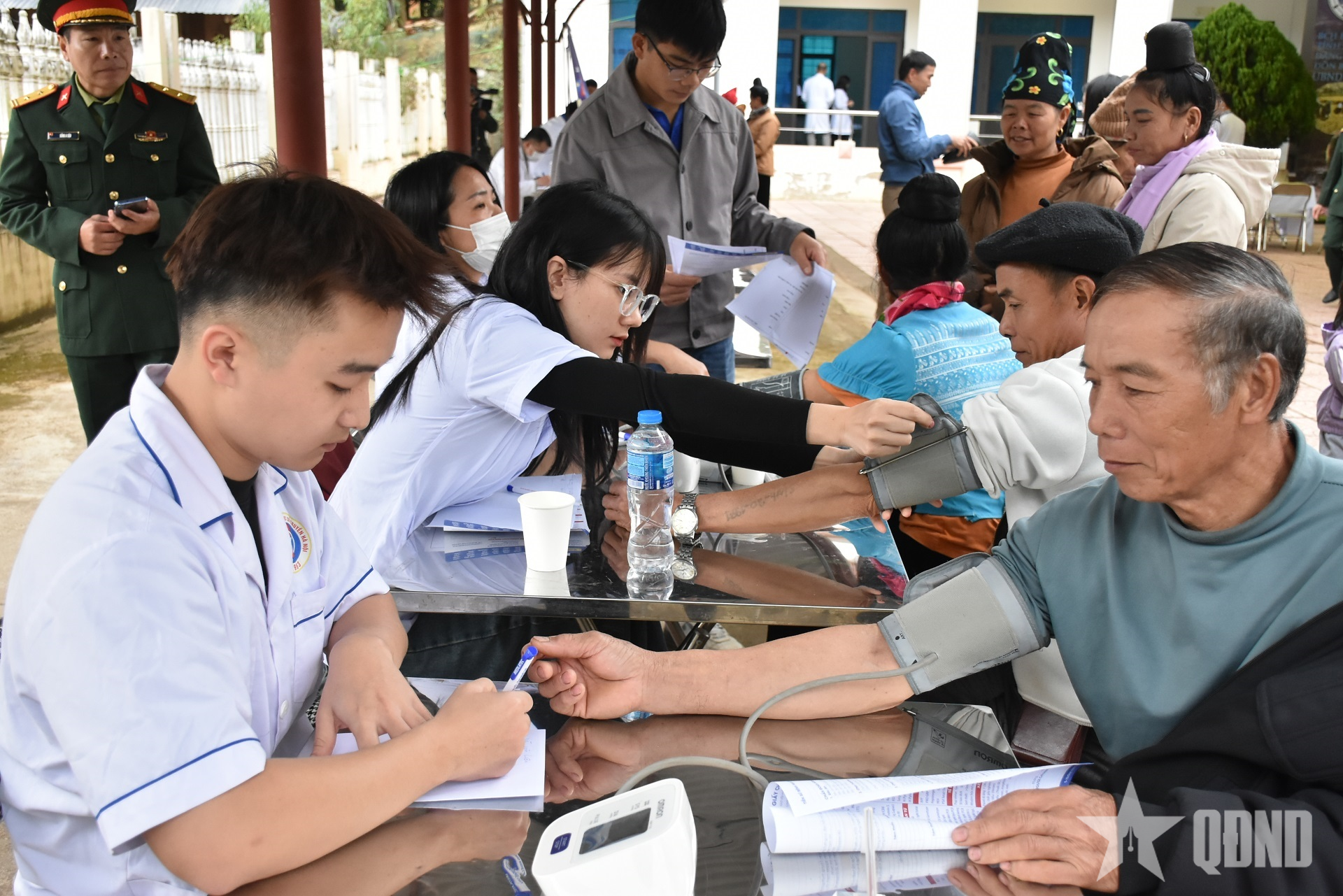 Các y, bác sĩ đo huyết áp kiểm tra sức khỏe người dân.