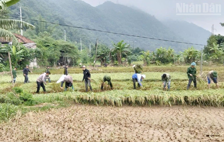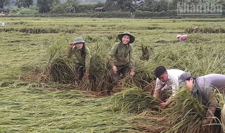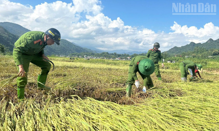 Hình ảnh các cán bộ xã, bản xen lẫn trong màu áo xanh tình nguyện và lực lượng công an giúp người dân gặt lúa trên cánh đồng mùa nước ngập đã lan tỏa tinh thần đoàn kết, sẻ chia với người dân vùng lũ, góp phần giúp bà con sớm ổn định đời sống, khôi phục sản xuất sau bão.
