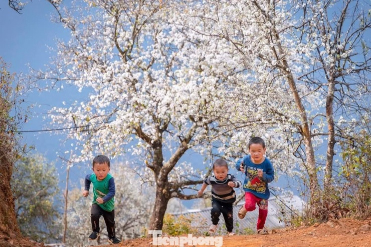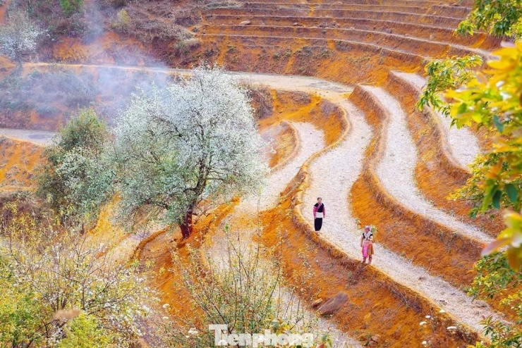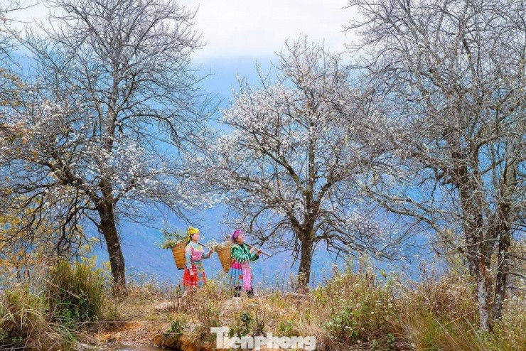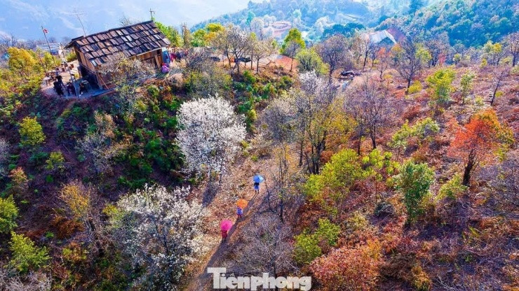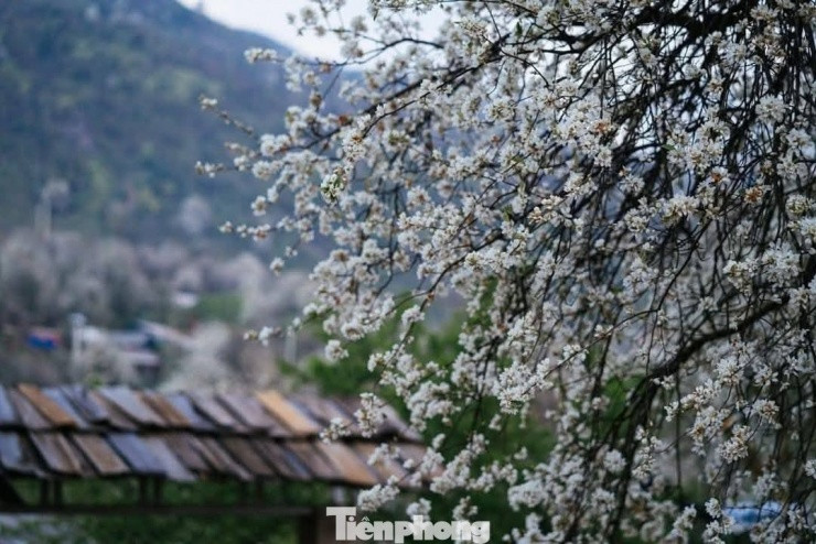Hoa sơn tra tại đây mang vẻ đẹp dung dị nhưng có sức hút kỳ lạ. Những cánh hoa trắng ngà, nhụy vàng nổi bật trên nền trời xanh nhạt. Khi nhìn từ xa, những tán cây sơn tra lớn bao phủ lấy những mái nhà gỗ đơn sơ của người Mông, tạo nên một bức tranh thiên nhiên hài hòa và thơ mộng.