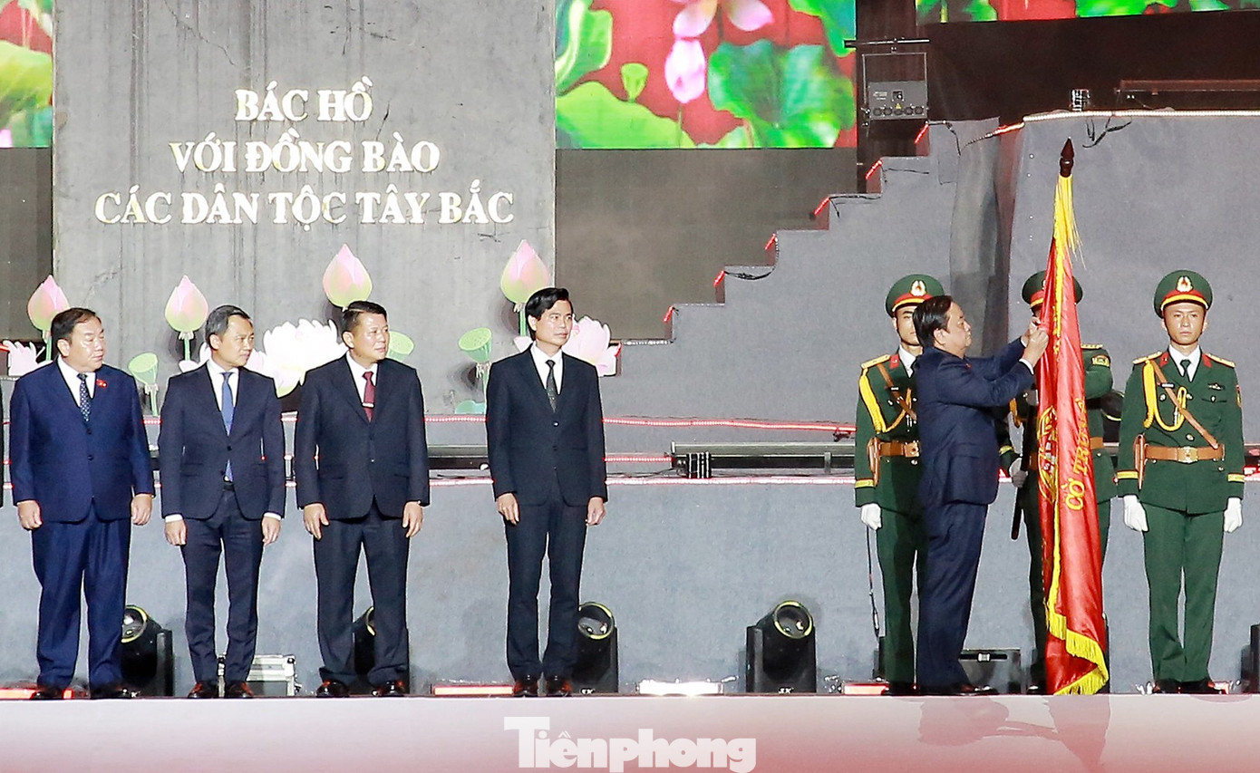 Phó Chủ tịch Quốc hội Lê Minh Hoan gắn Huân chương Lao động hạng Nhất lên Cờ truyền thống của Đảng bộ, chính quyền và nhân dân các dân tộc tỉnh Sơn La.