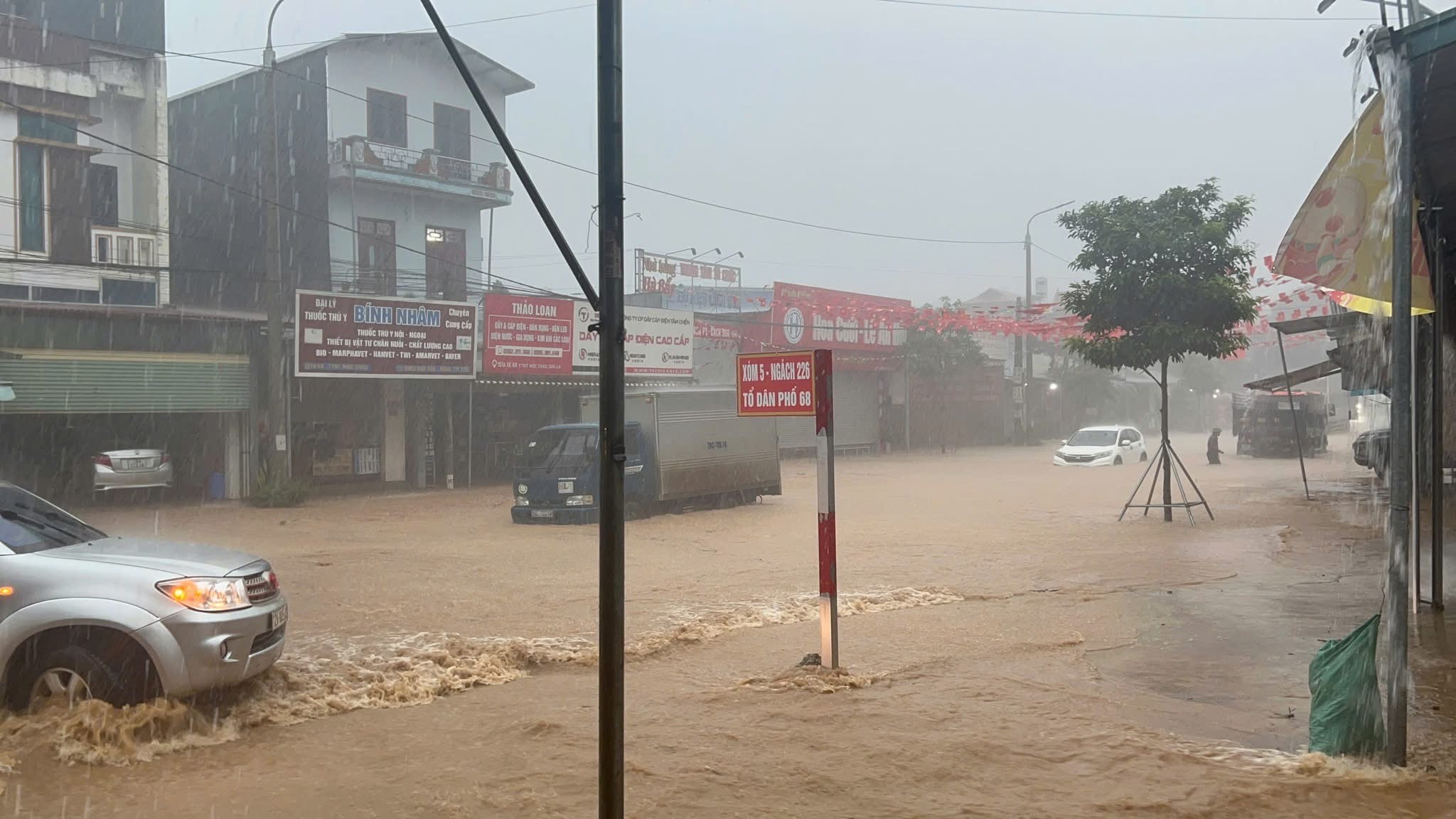 Tại tỉnh Sơn La, mưa lớn từ rạng sáng nay khiến nhiều tuyến đường ngập sâu, đặc biệt khu vực phường Vân Sơn, phường Mộc Châu (nhất là khu vực nông trường Mộc Châu). Mưa như trút khiến nước mưa dâng cao tràn vào Bệnh viện Đa khoa Mộc Châu.