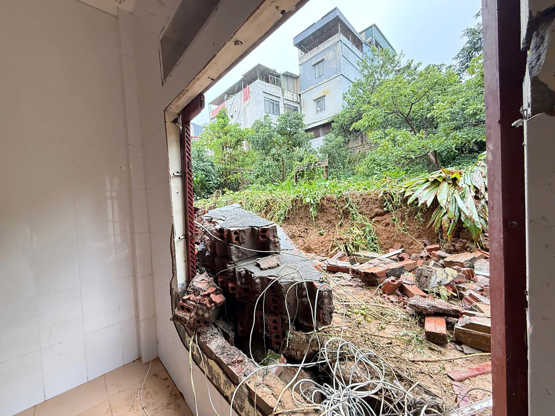 Bức tường kè khu dân cư phía sau Bệnh viện bị đổ sập khiến nước như lũ tràn vào khuôn viên bệnh viện. Ảnh: BVCC