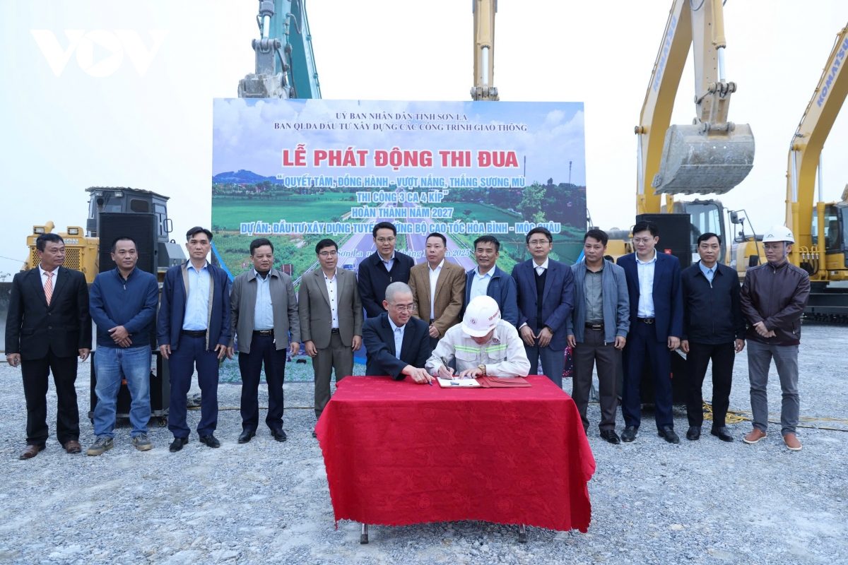 Tại Lễ phát động thi đua hoàn thành Dự án Đầu tư xây dựng tuyến đường bộ cao tốc Hòa Bình - Mộc Châu, đoạn tuyến thuộc địa phận tỉnh Sơn La, Ban Quản lý đầu tư xây dựng các công trình giao thông tỉnh Sơn La và các nhà thầu xây lắp đã ký cam kết phối hợp triển khai dự án.