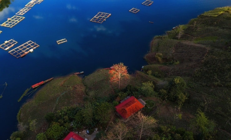 Sắc đỏ hoa gạo rực rỡ giữa không gian trời nước mênh mang tại vùng ven Sông Đà, Quỳnh Nhai.