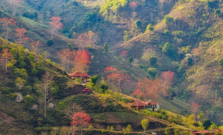 Dọc theo các triền suối, bờ sông hay ngay đầu bản, những bóng gạo vươn cao kiêu hãnh. Thân cây xù xì, cành lá khẳng khiu nhưng ẩn chứa sức sống mãnh liệt, bền bỉ như chính tính cách của con người nơi đây. Khi tiết trời chuyển giao, hoa gạo đồng loạt bừng tỉnh, biến những cành cây trơ trụi thành những ngọn đuốc rực lửa giữa không gian hùng vĩ.
