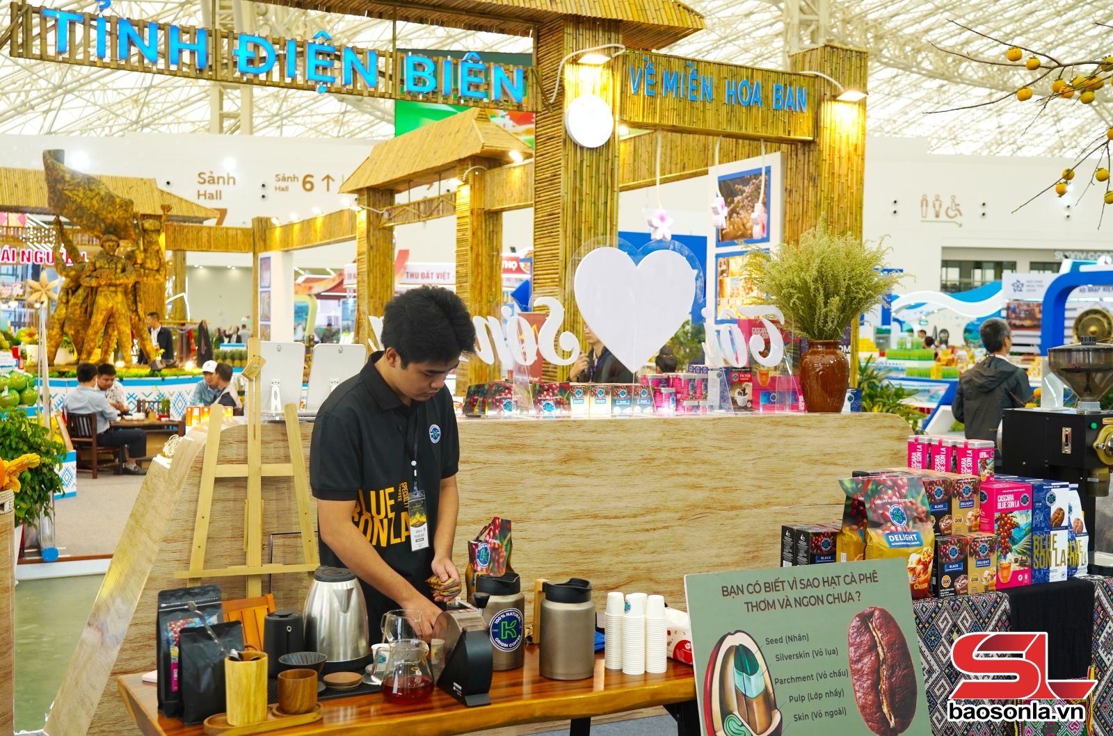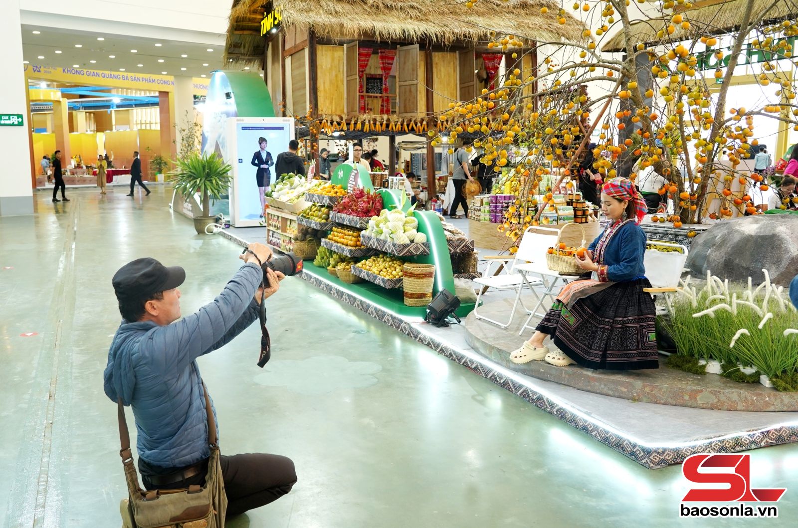 Giữa 3.000 gian hàng sôi động, gian trưng bày của tỉnh Sơn La nổi bật như một bức tranh sống động mang dấu ấn của vùng núi Tây Bắc. Gian hàng Sơn La rộng hơn 200 m² thiết kế theo hình ảnh núi rừng Tà Xùa, mùa hồng giòn ở Mộc Châu… đan xen các yếu tố hiện đại và truyền thống. Du khách được chào đón bởi những điệu xòe Thái rộn ràng và những bộ trang phục thổ cẩm rực rỡ của dân tộc Thái; được tham gia trải nghiệm giã bánh dày truyền thống của đồng bào dân tộc Mông… được thưởng thức cà phê, chè và mua sắm các loại nông sản đặc trưng của tỉnh bày bán tại gian hàng.