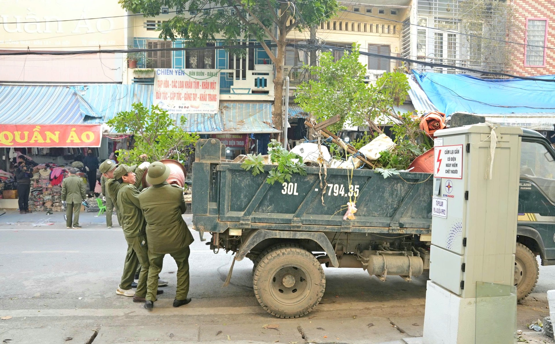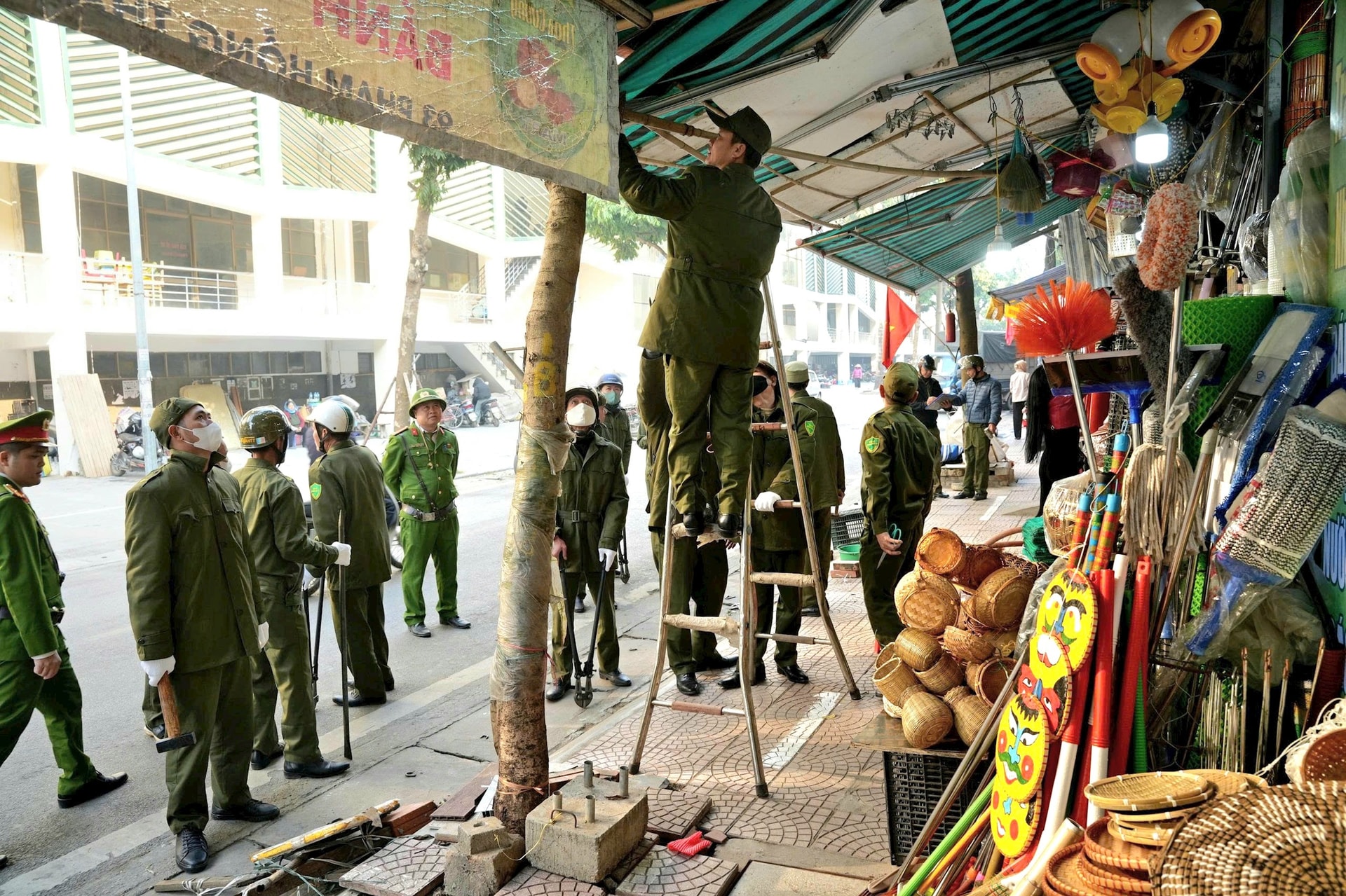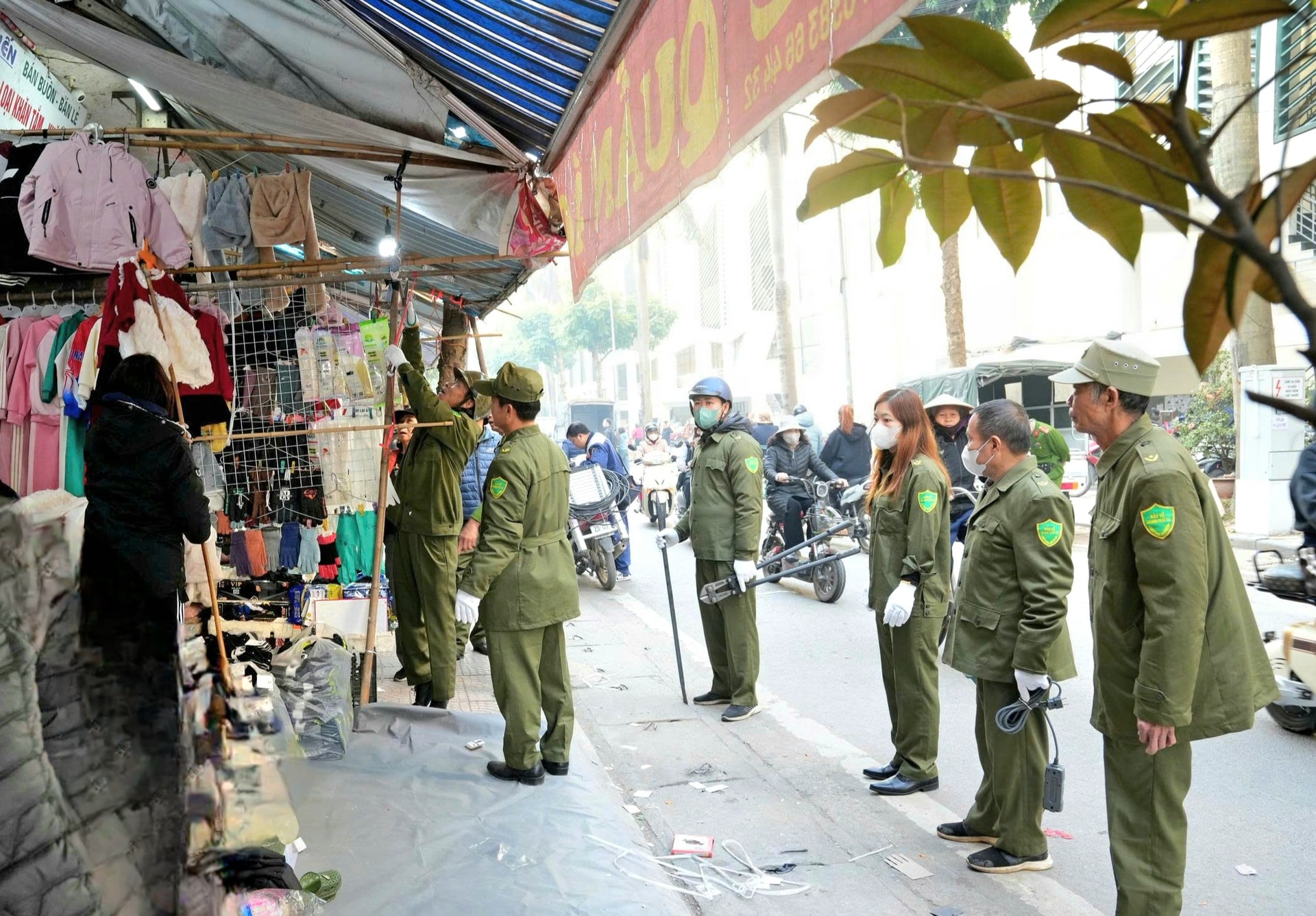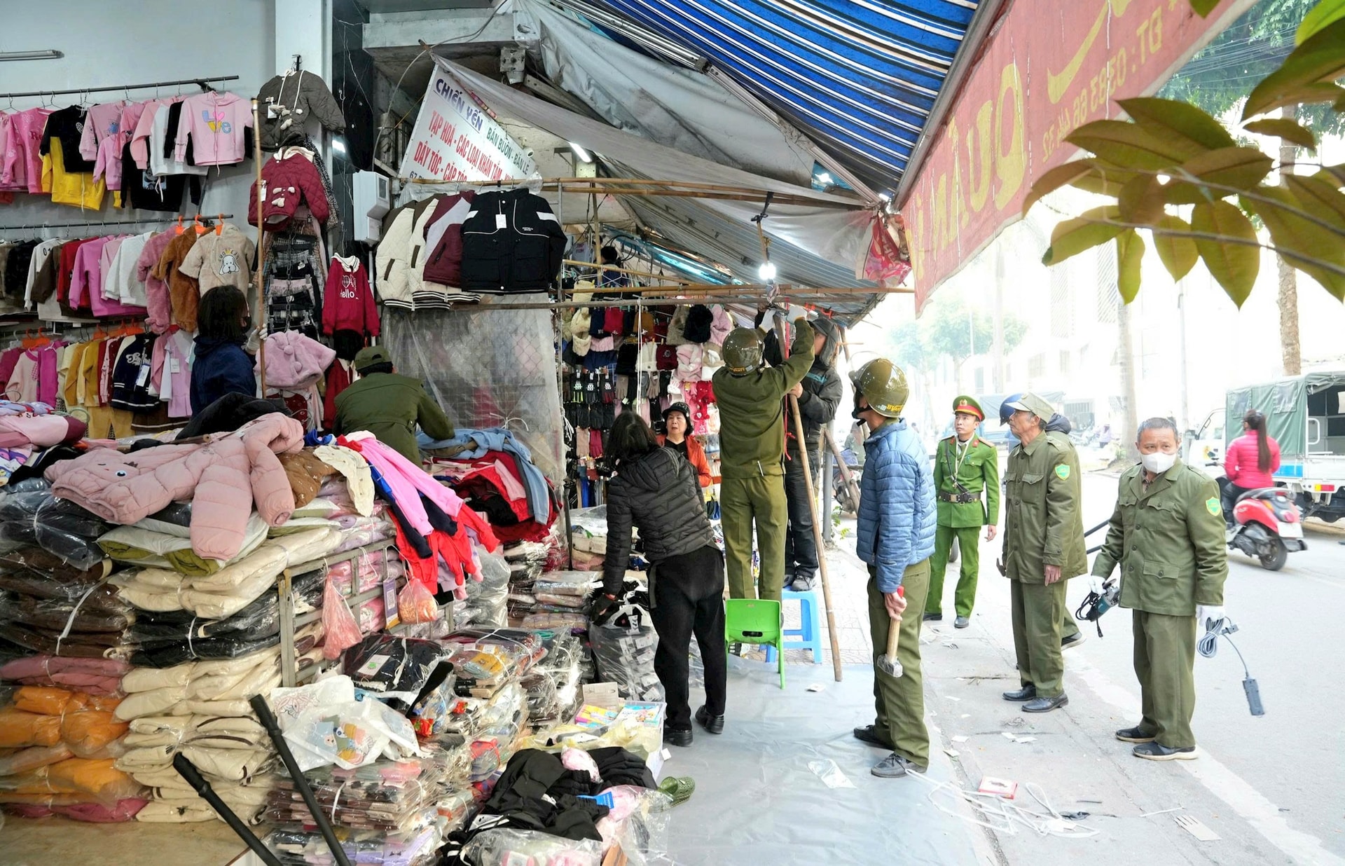 Lực lượng chức năng nhắc nhở các hộ kinh doanh thu gọn hàng hóa bày trên vỉa hè. Ảnh: Sơn Tây
