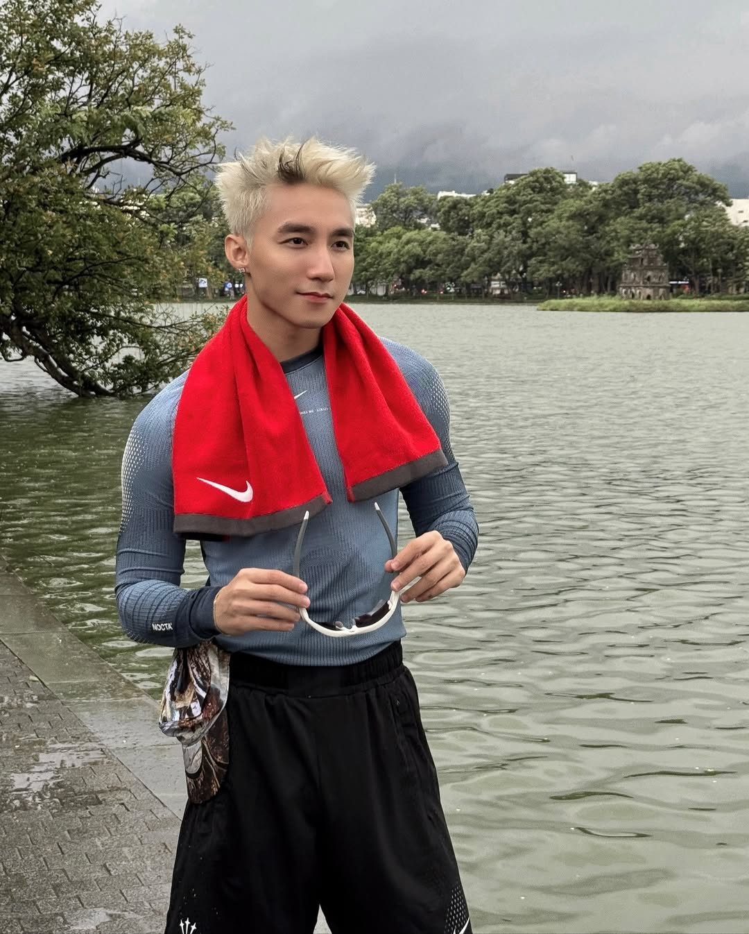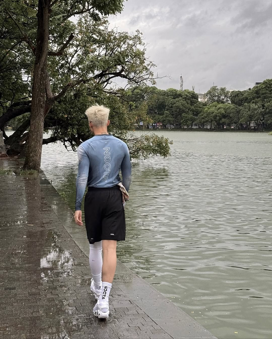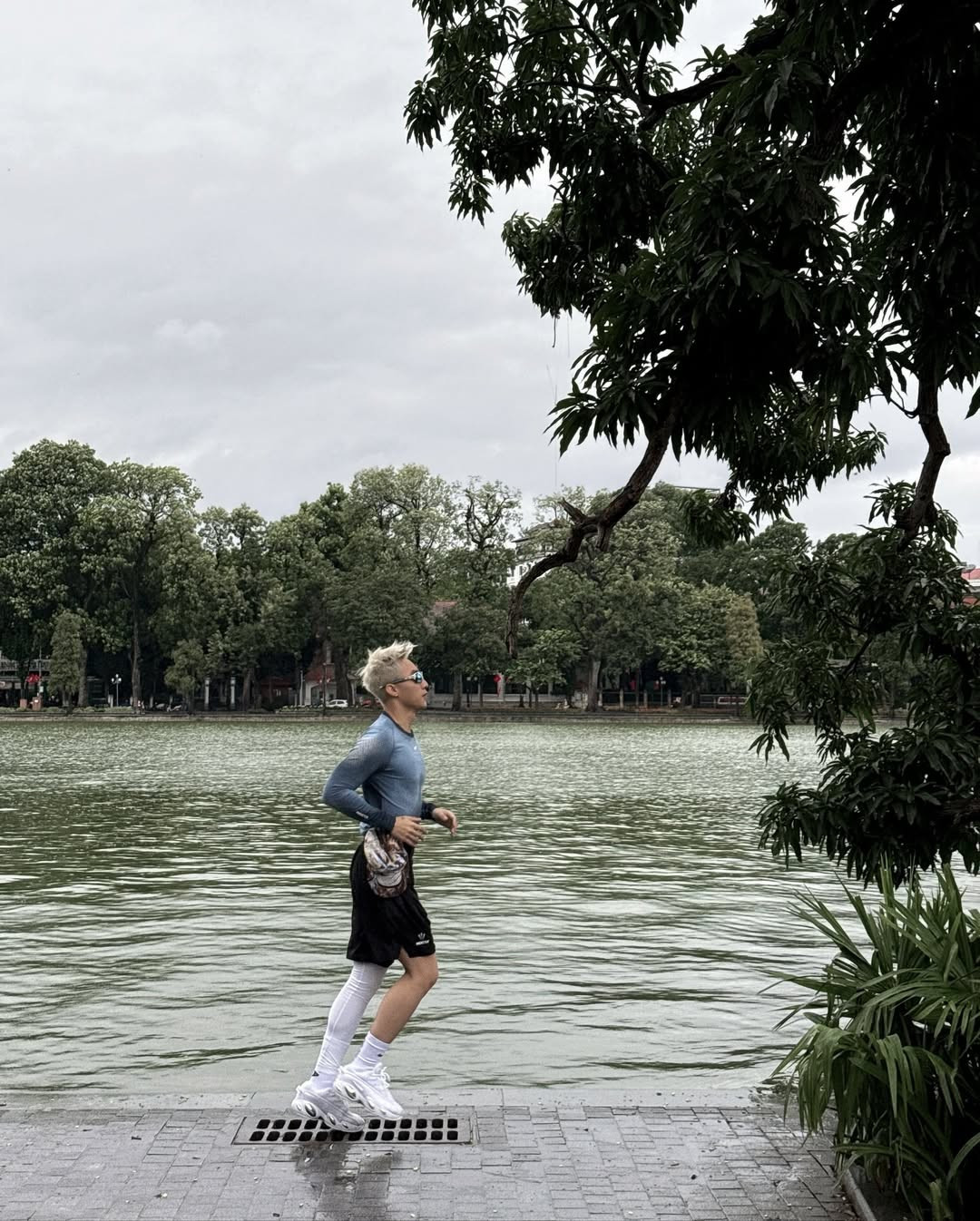 Trong các bức ảnh, có thể thấy Sơn Tùng vừa chạy bộ, vừa dừng lại nghỉ ngơi và ngắm cảnh Hồ Gươm. Anh chàng cũng không quên check-in với những góc quen thuộc như bờ hồ, hàng cây rủ bóng và cả Tháp Rùa ẩn hiện xa xa.