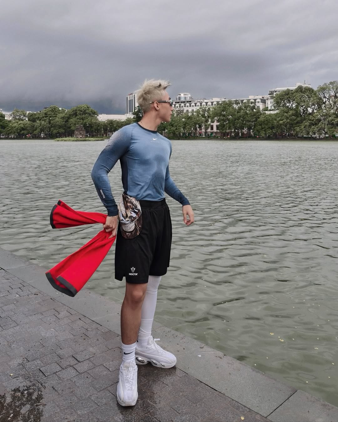 Nam ca sĩ diện trang phục thể thao với áo thun dài tay màu xanh xám, quần short đen, cùng phụ kiện là tất và giày thể thao trắng. Anh còn khoác hờ chiếc khăn màu đỏ nổi bật, tạo điểm nhấn rực rỡ trên nền trời âm u của Hà Nội.