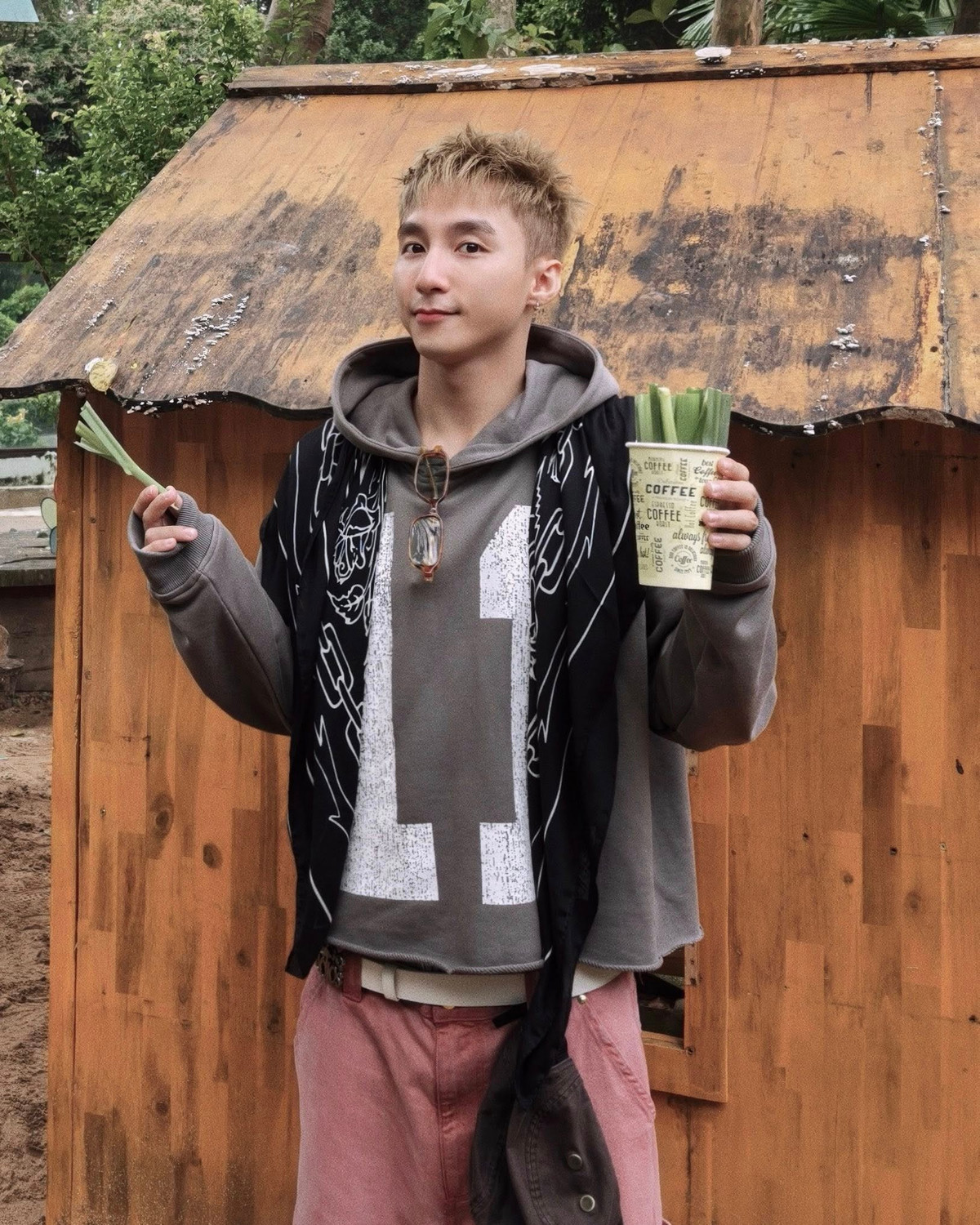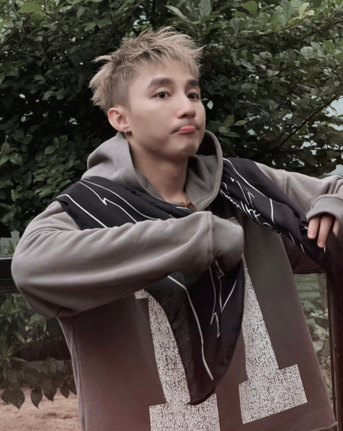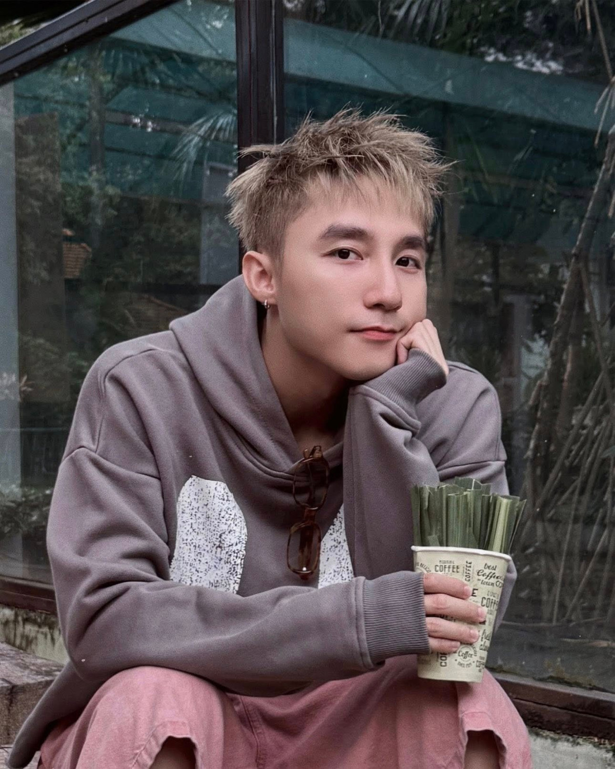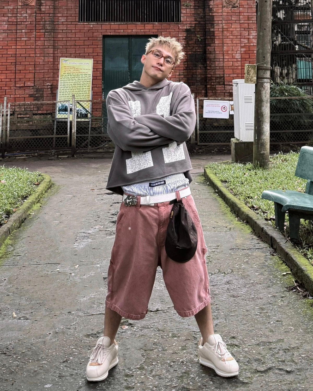 Về phong cách thời trang, Sơn Tùng M-TP vẫn giữ vững sự cá tính và năng động quen thuộc. Anh diện áo hoodie màu xám có họa tiết chữ số lớn, phối cùng quần jeans lửng màu hồng và đi giày thể thao màu kem. (Ảnh: FBNV)
